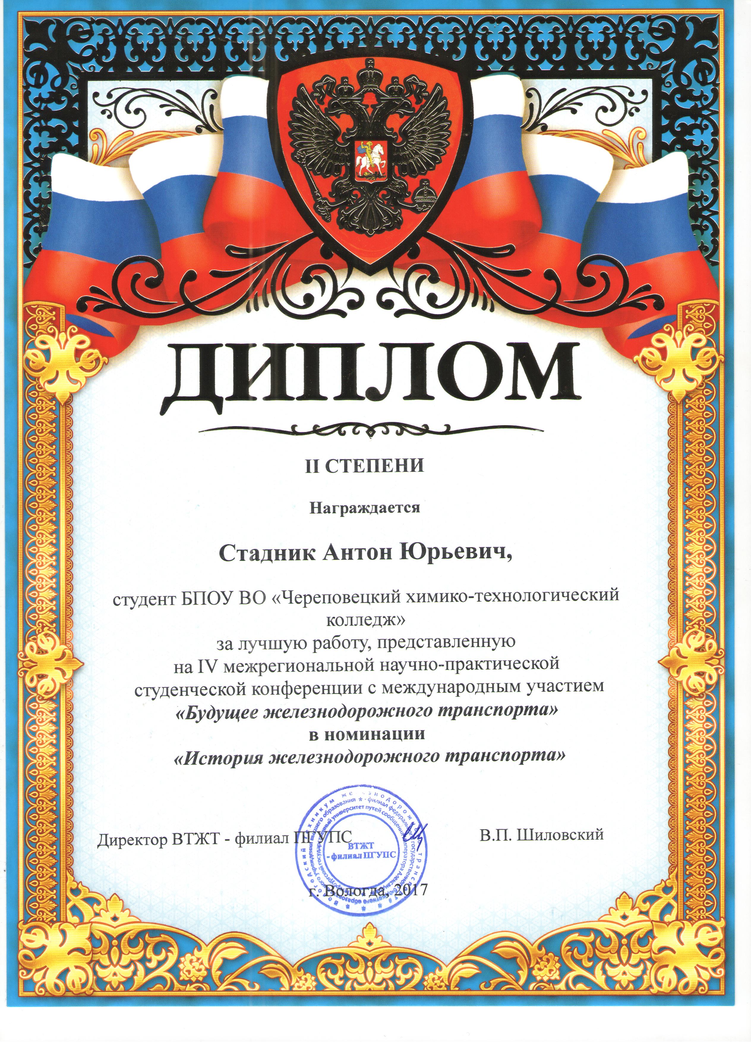 От БПОУ ВО «Череповецкий химико-технологический колледж» в конференции принял участие студент третьего курса по профессии «Машинист локомотива» Стадник Антон Юрьевич, который представил исследовательскую работу на тему «Локомотивное депо «Череповец»: вчера, сегодня, завтра» и проект «Подготовка квалифицированных специалистов для ОАО «РЖД» через развитие профессиональной компетентности студентов по профессии «Машинист локомотива».